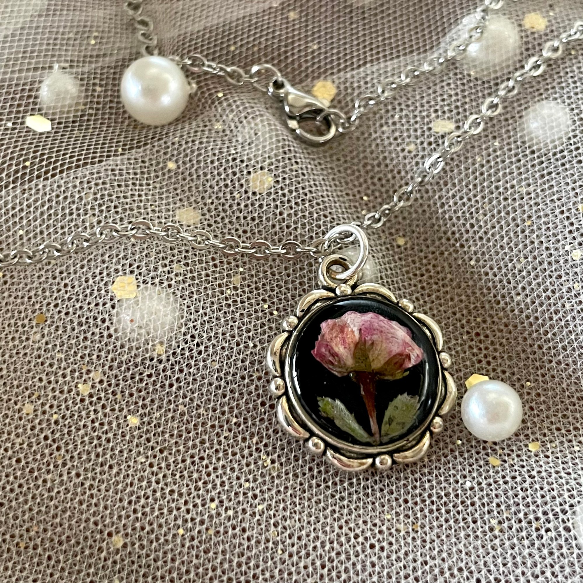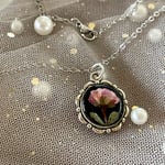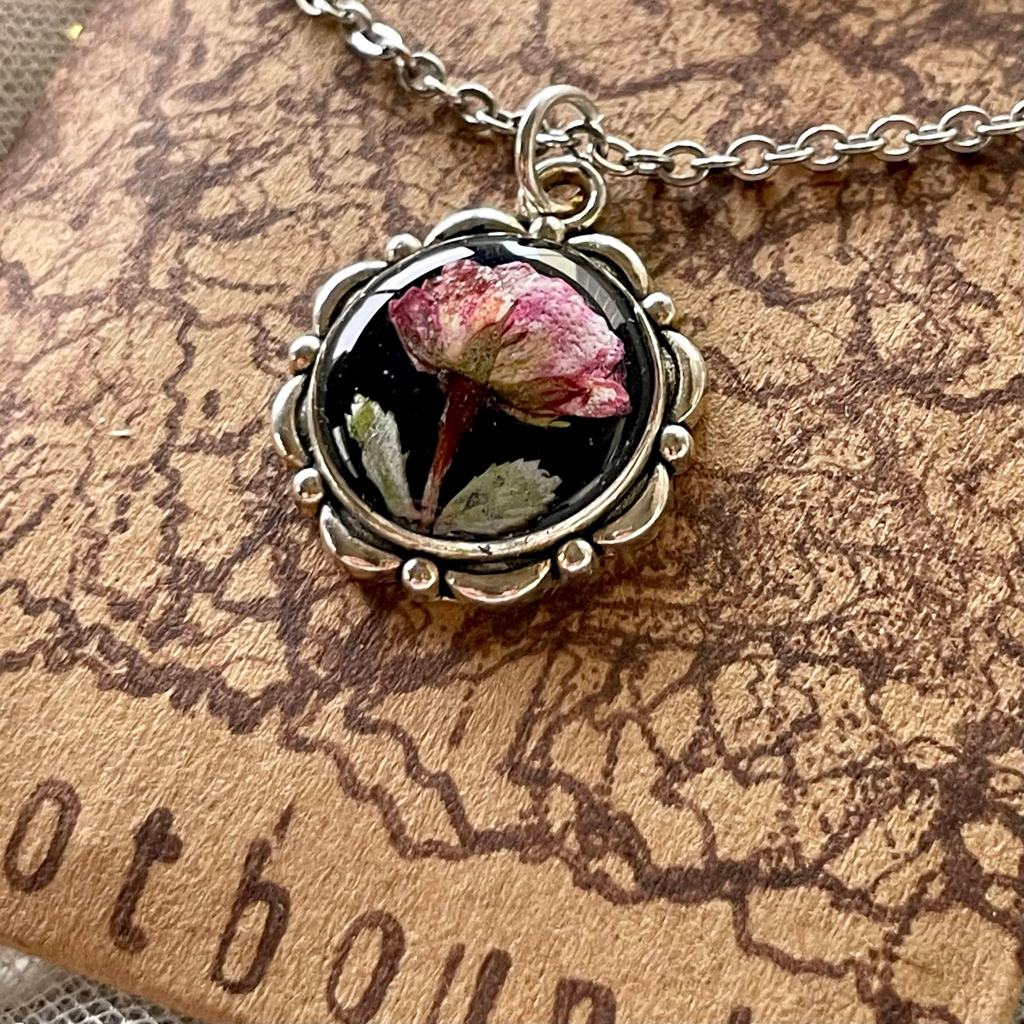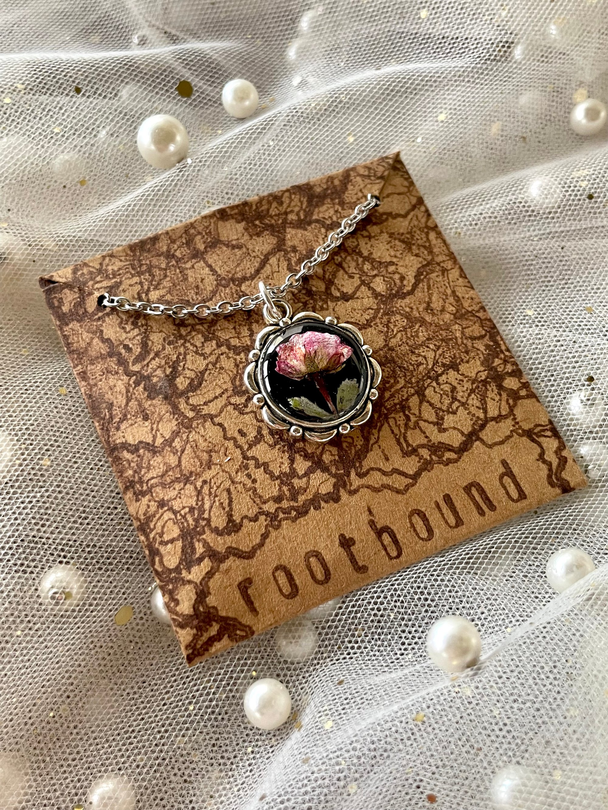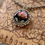 Lovingly crafted, classic, minimalist, floral handmade pendant necklace, featuring a real mini rose bloom preserved in resin.