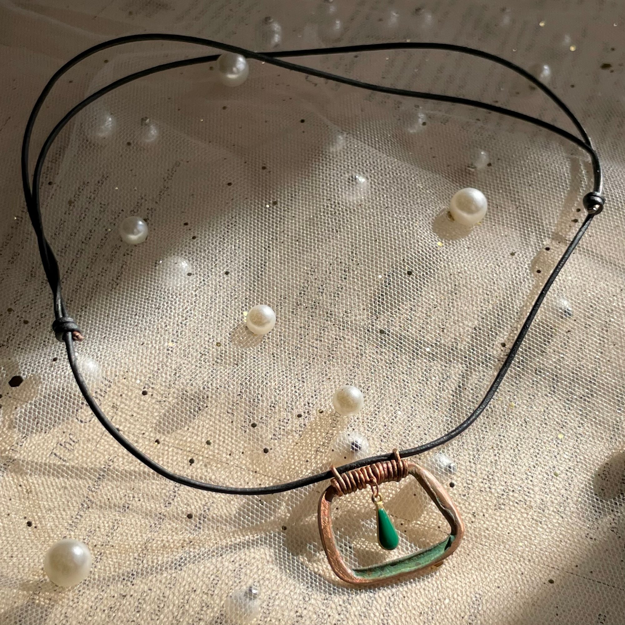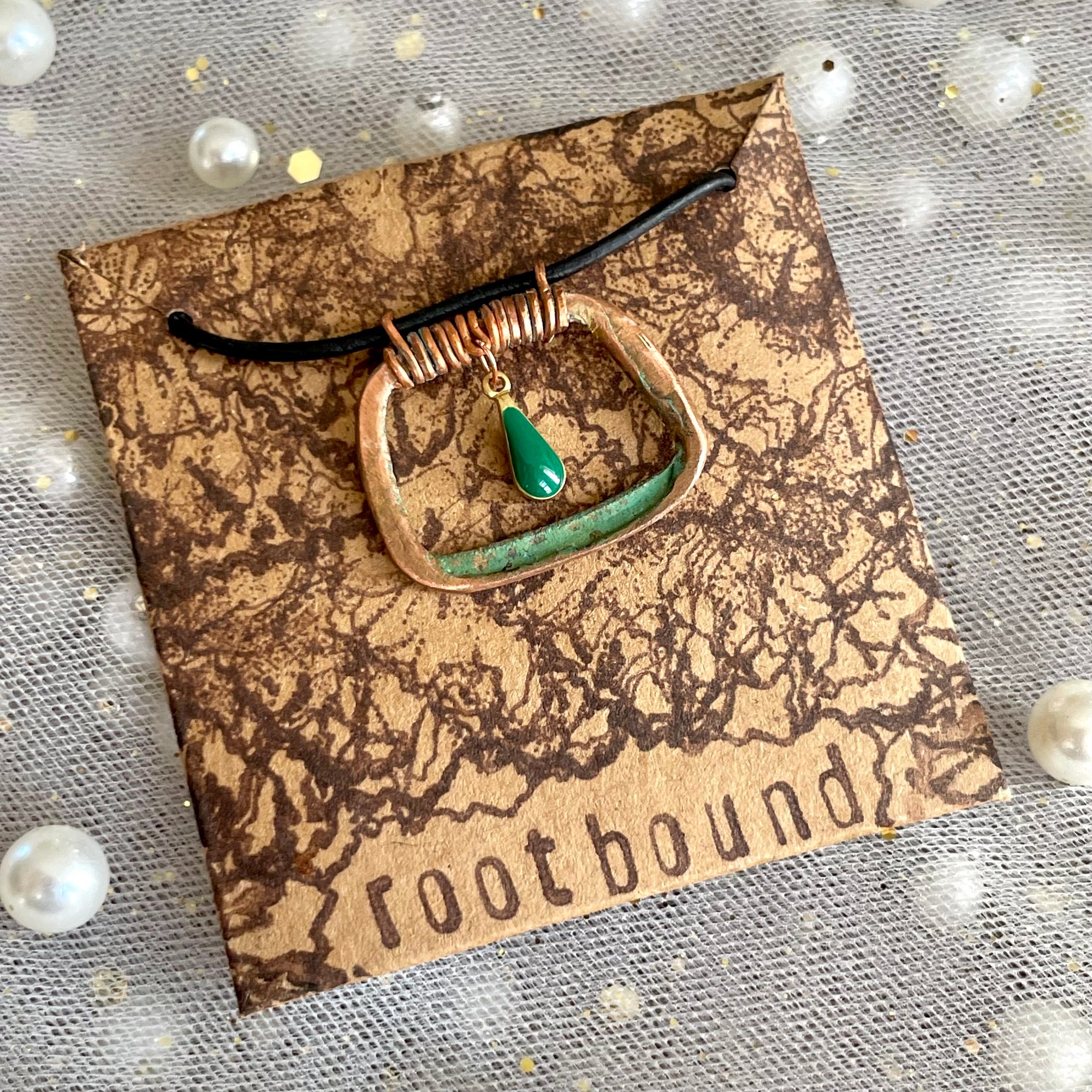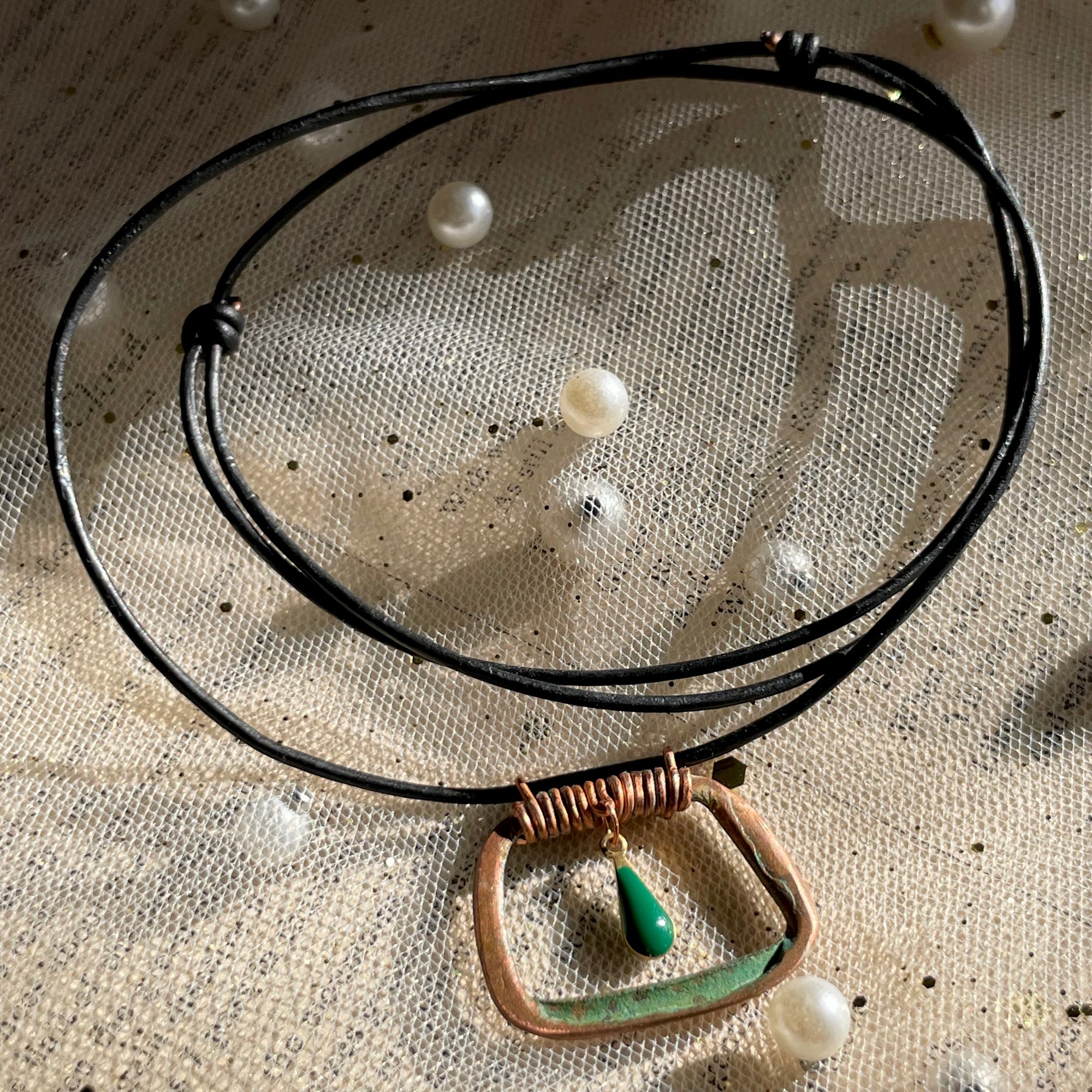 Handmade geometric minimalist trapezoid green copper patina pendant necklace with corresponding teardrop charm on adjustable black leather cord. This piece started its life out as a recycled copper pipe and has been lovingly transformed into the necklace you see above.
