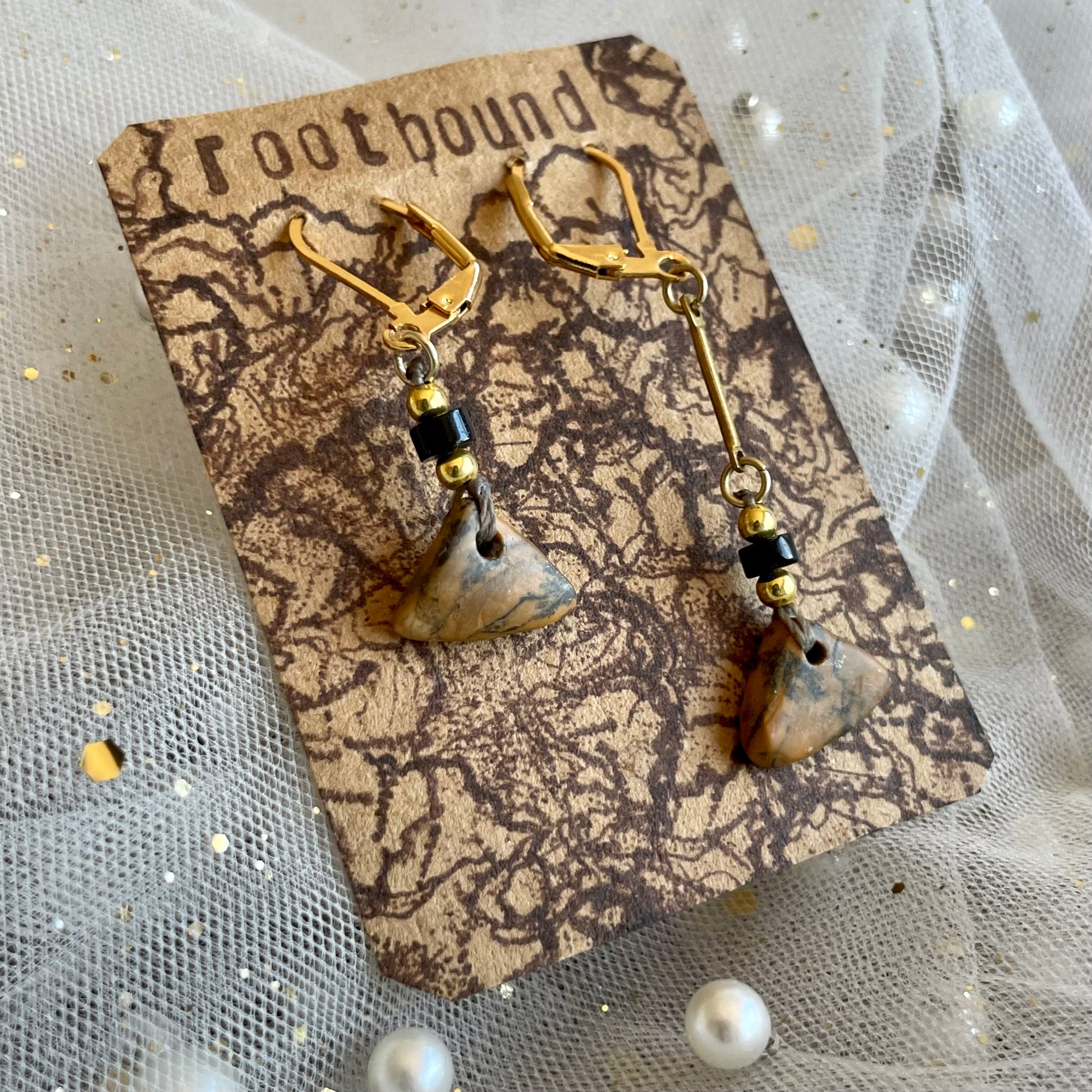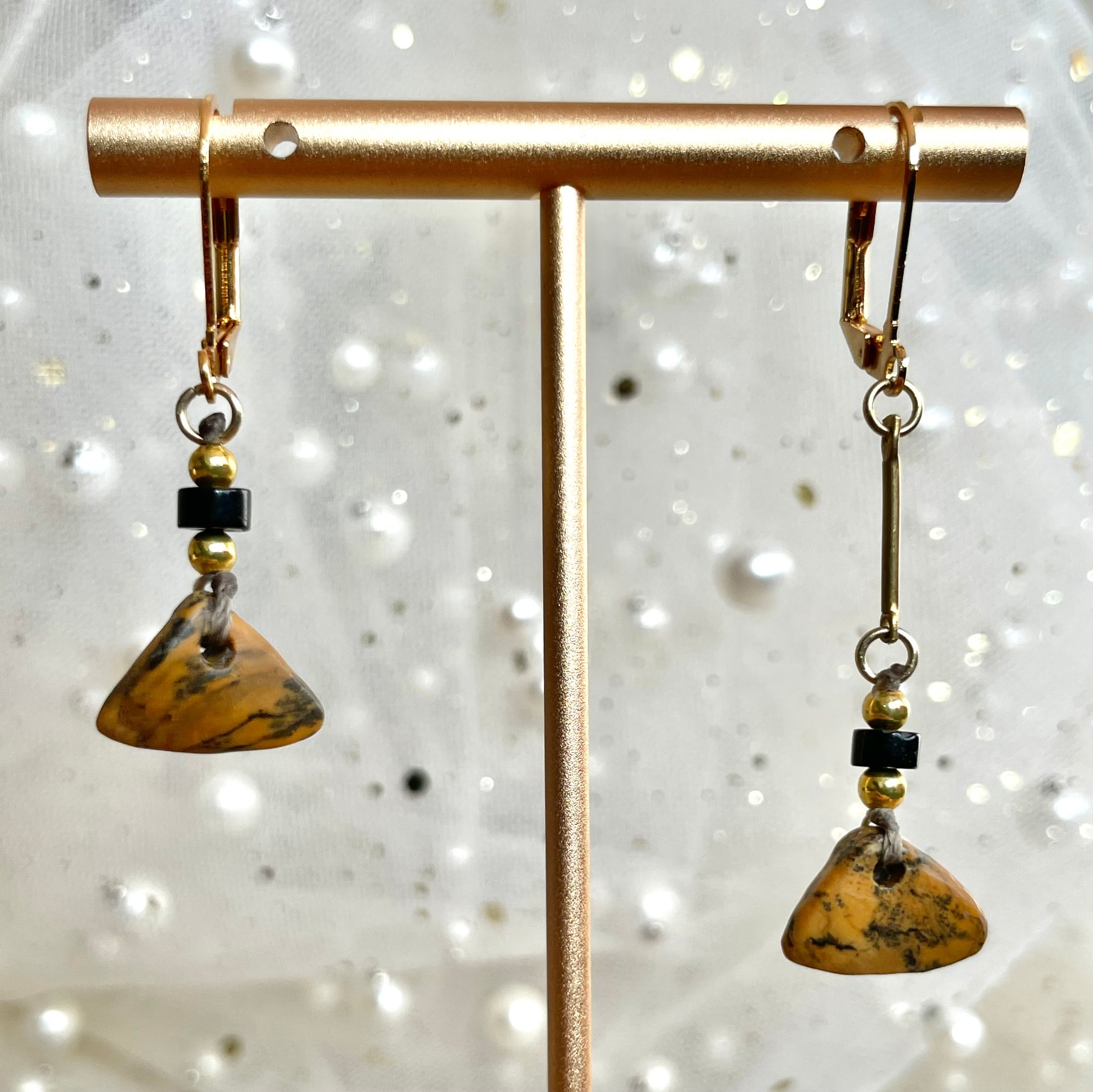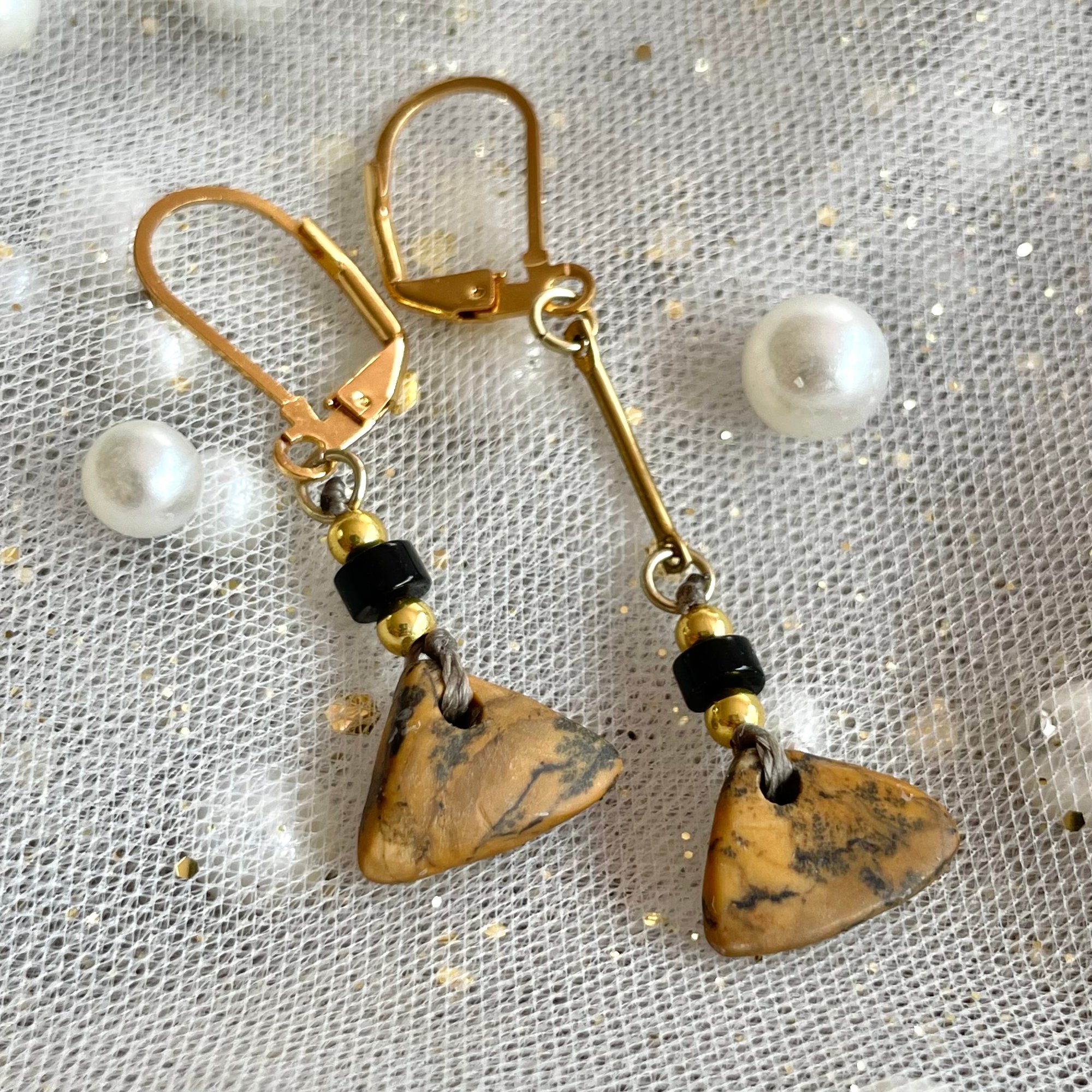 One-of-a-kind, shaped and beaded by hand, these earrings carry their own history, echoing the quiet asymmetry of nature itself. Handcrafted from genuine petrified wood, they hold the memory of trees turned to stone, where time and mineral met in silence. The golden-brown tones of the wood pair beautifully with deep black and gold-colored accents.