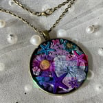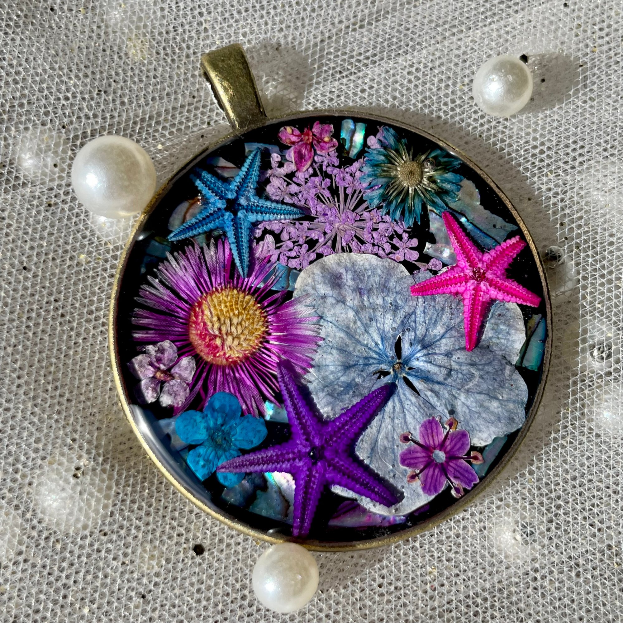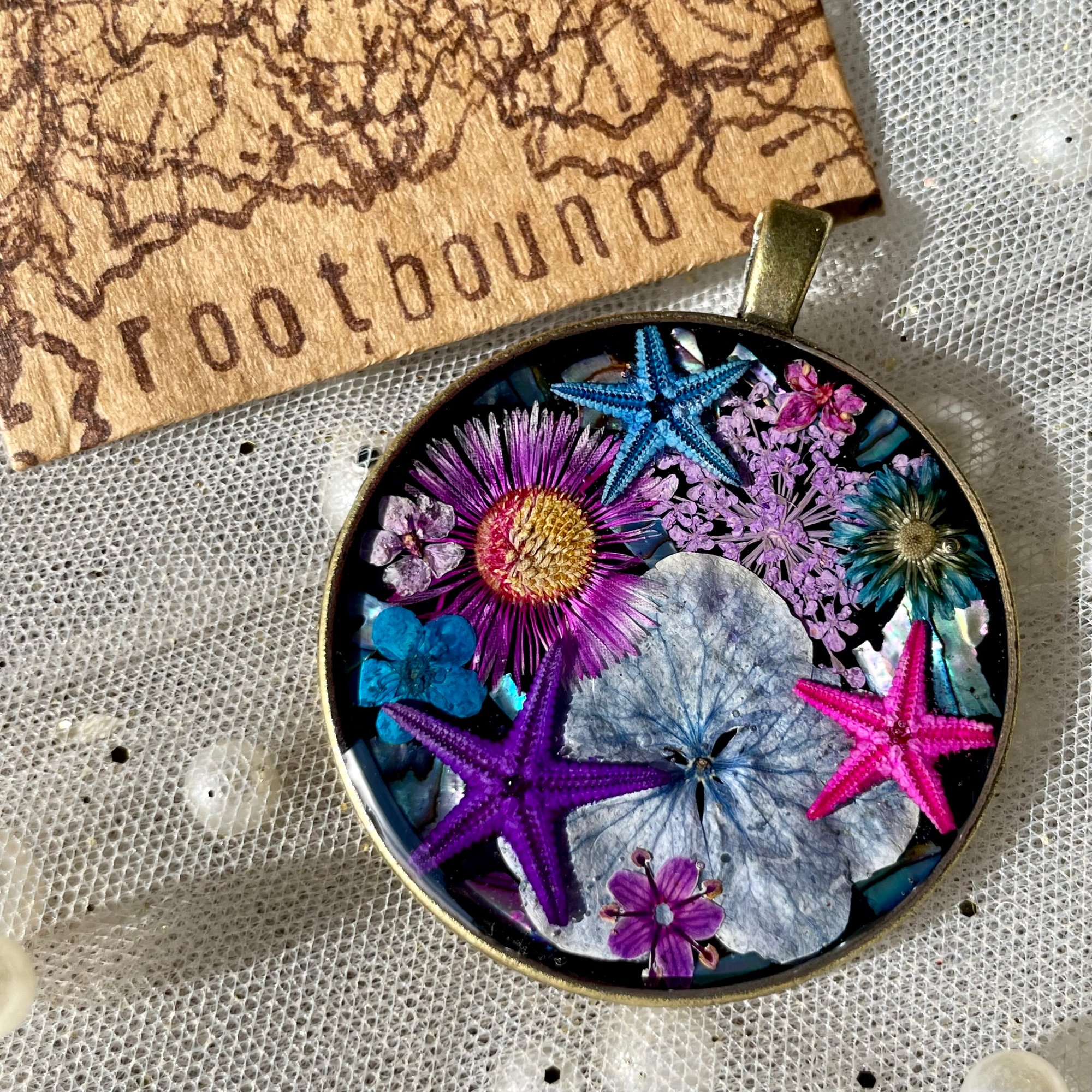 Lovingly crafted, floral ocean-themed pendant, featuring real pressed blooms preserved in resin and set in a metal bezel. Each piece is one of a kind; a small garden to carry with you.