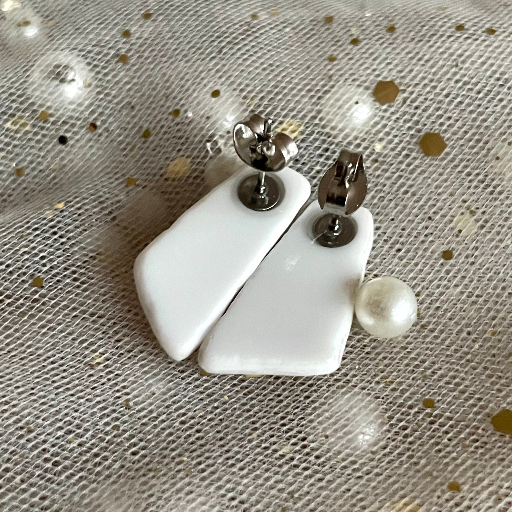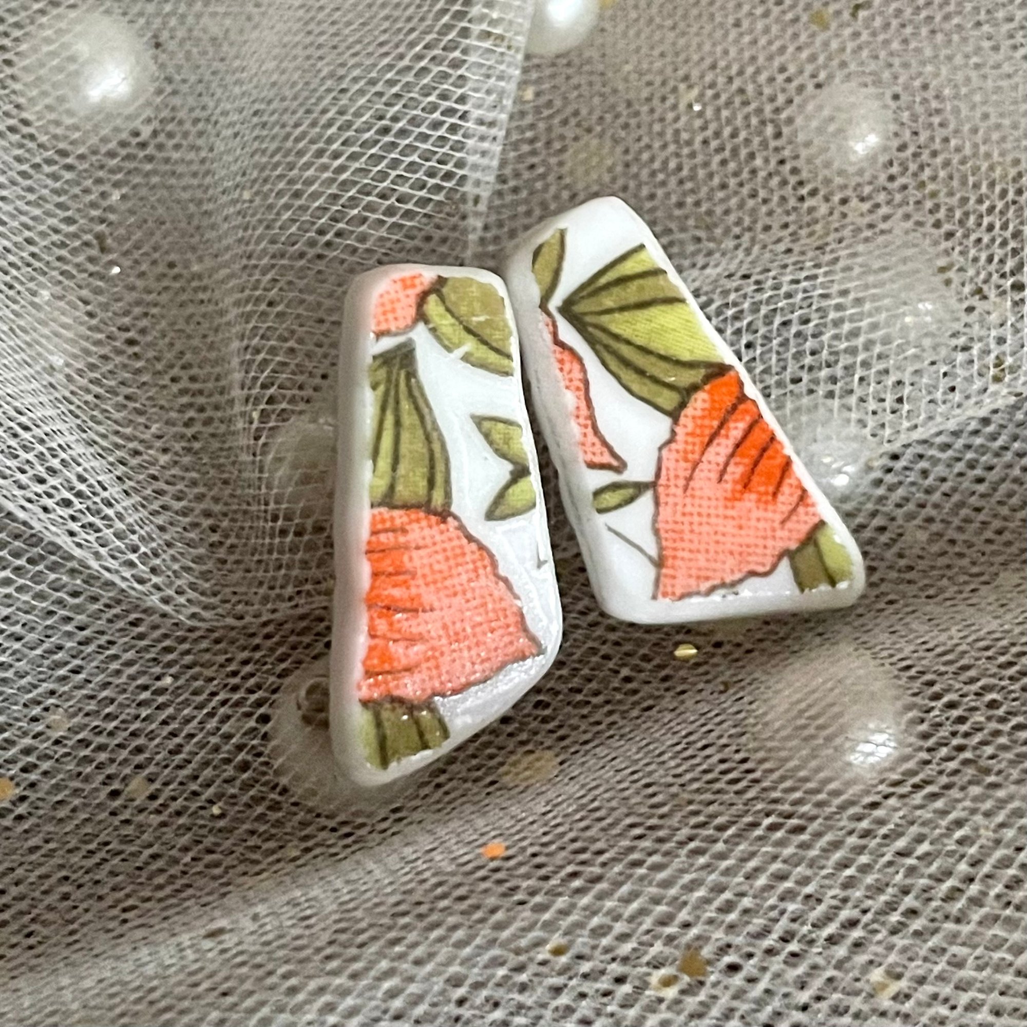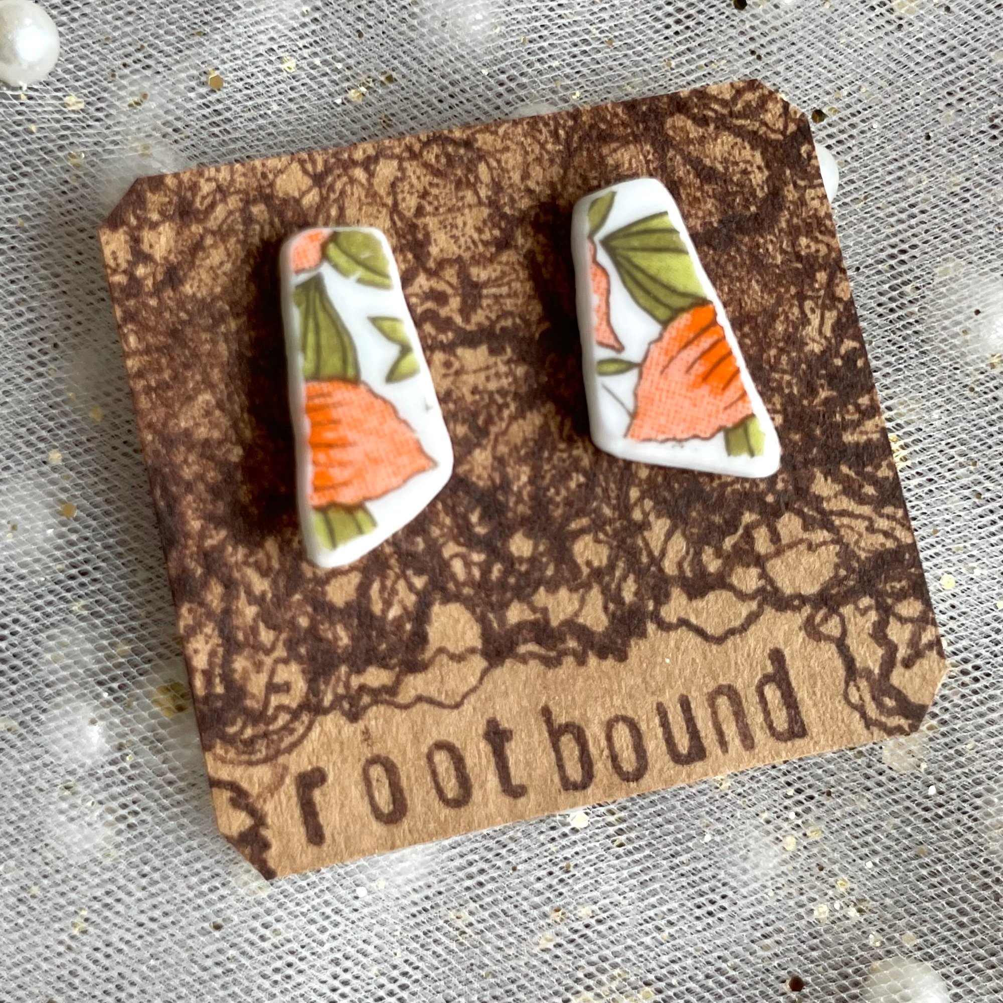 A proprietary blend of elegant and jesty, these stud earrings started out their life as a vintage ‘70s Corelle ‘Indian Summer’ plate, an heirloom carrying warm memories of laughter around the table. Carefully crafted, each piece is hand-drilled and shaped before becoming these darling stud earrings.