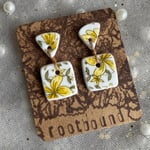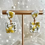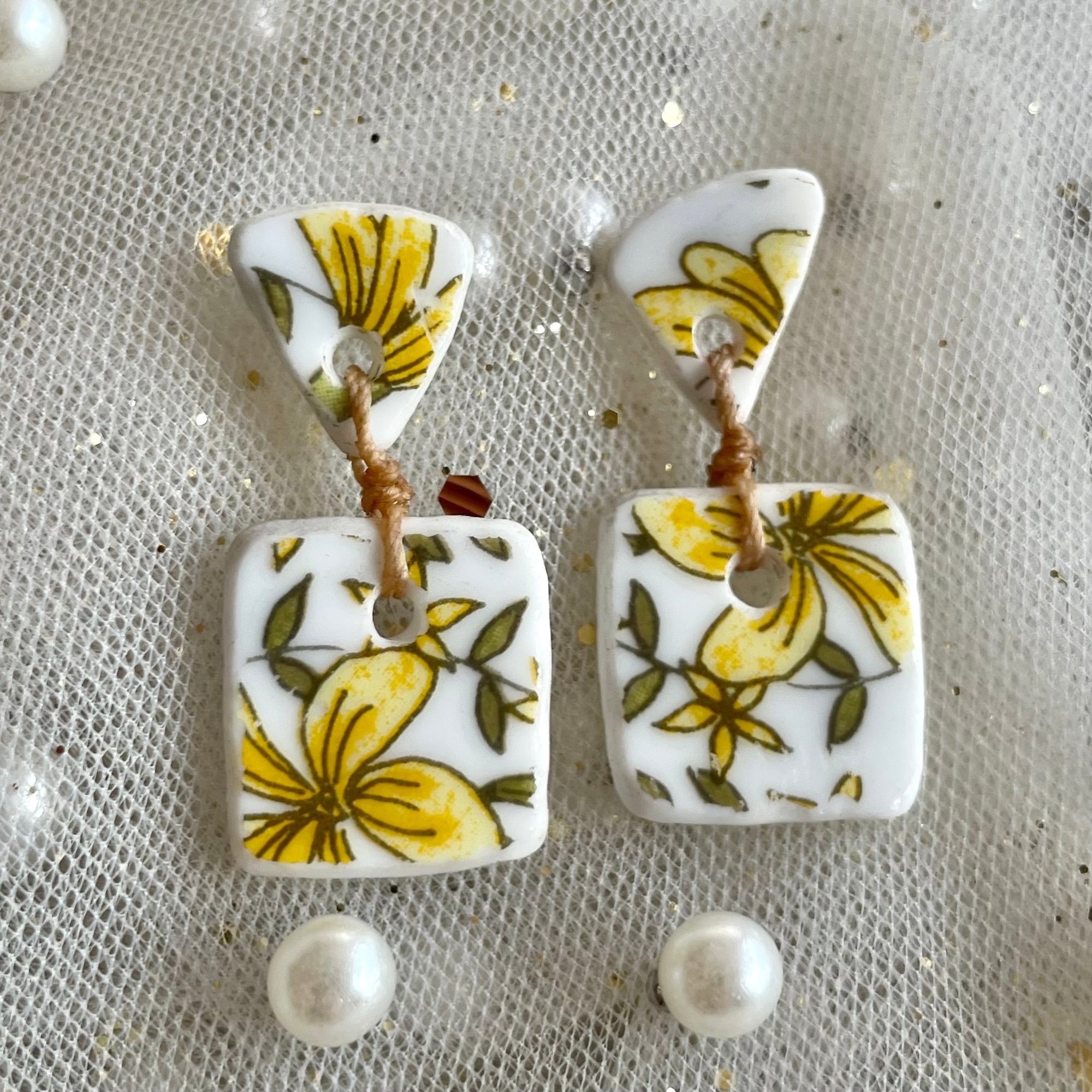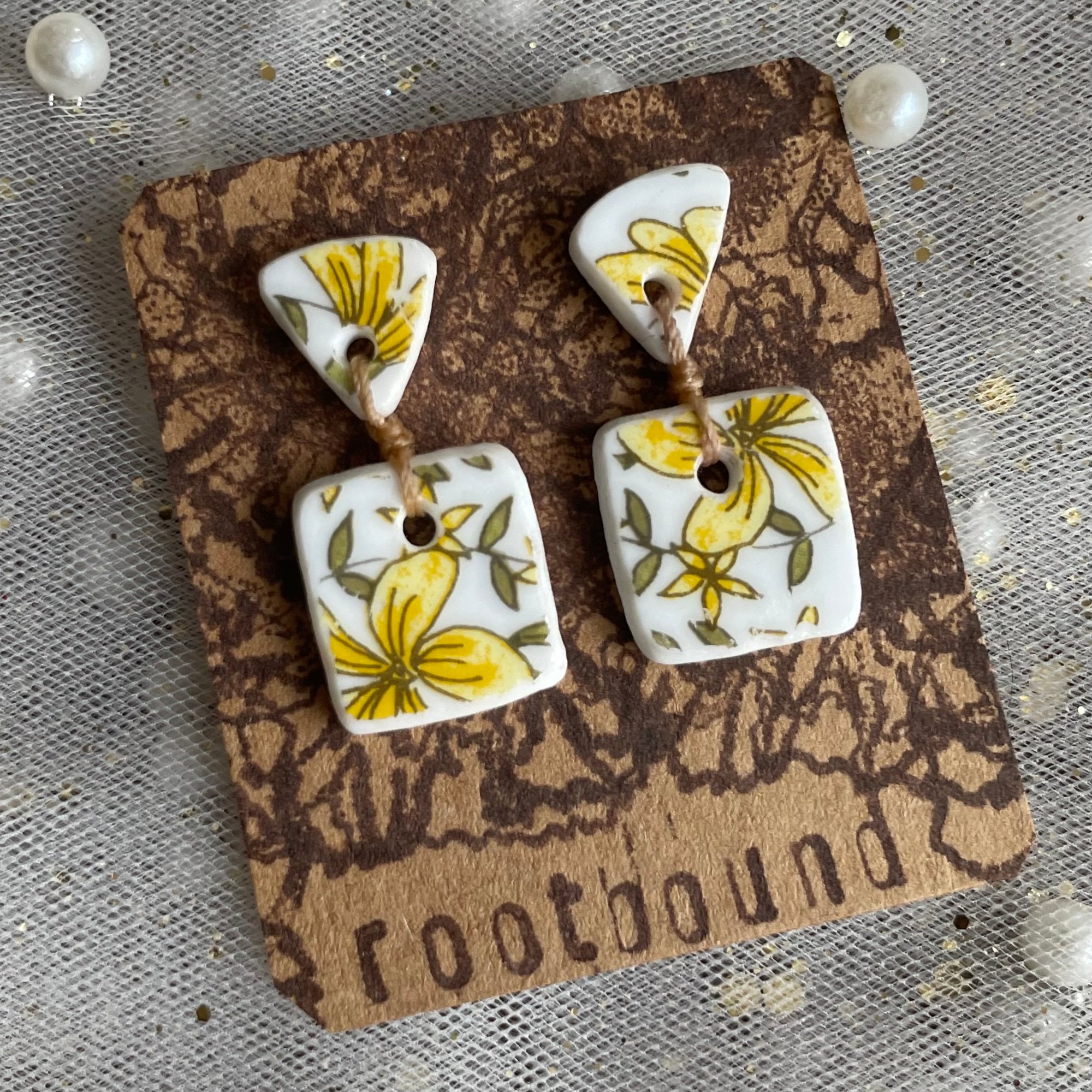 A proprietary blend of elegant and jesty, these dangle earrings started out their life as a vintage ‘70s Corelle ‘Indian Summer’ plate, an heirloom carrying warm memories of laughter around the table. Carefully crafted, each piece is hand-drilled and shaped, with the posts countersunk for maximum comfort.