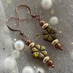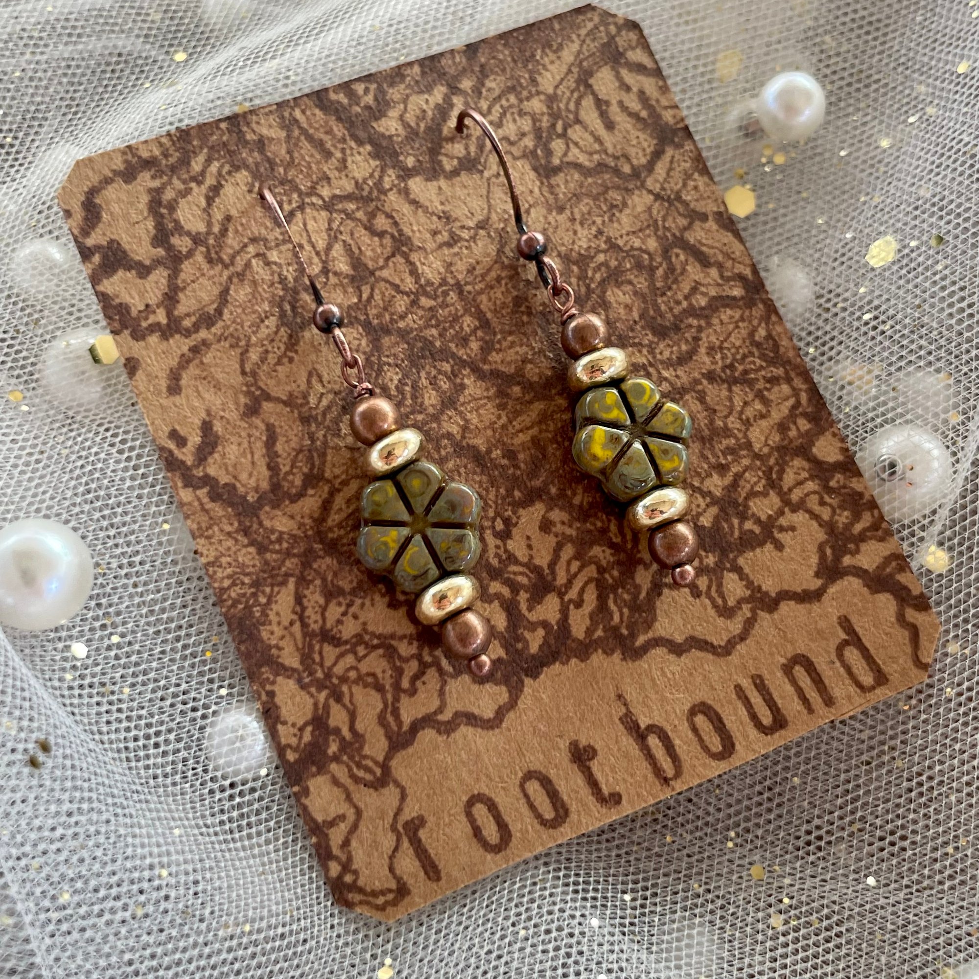 Handcrafted, Czech glass floral beaded dangle earrings featured on copper plated hooks.
