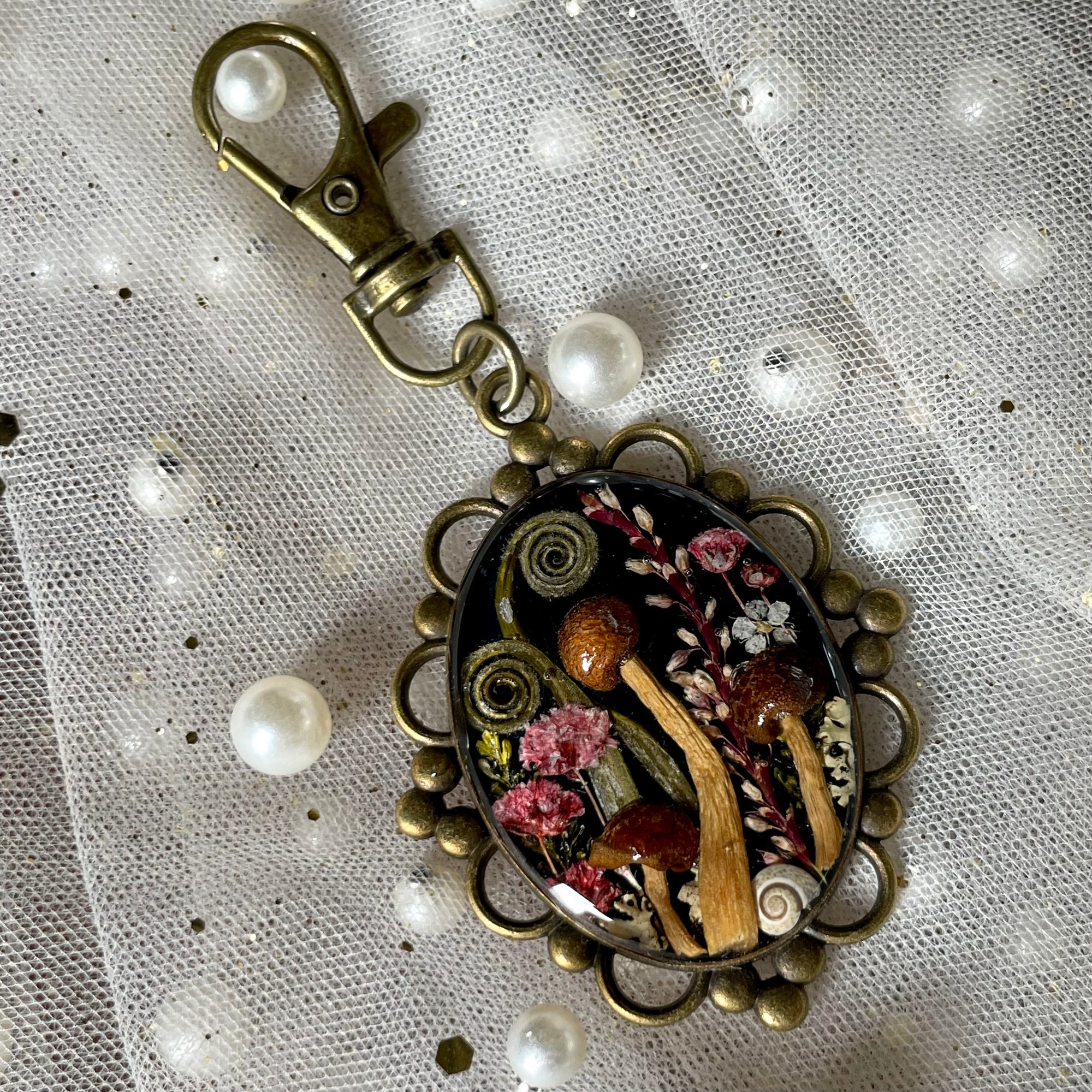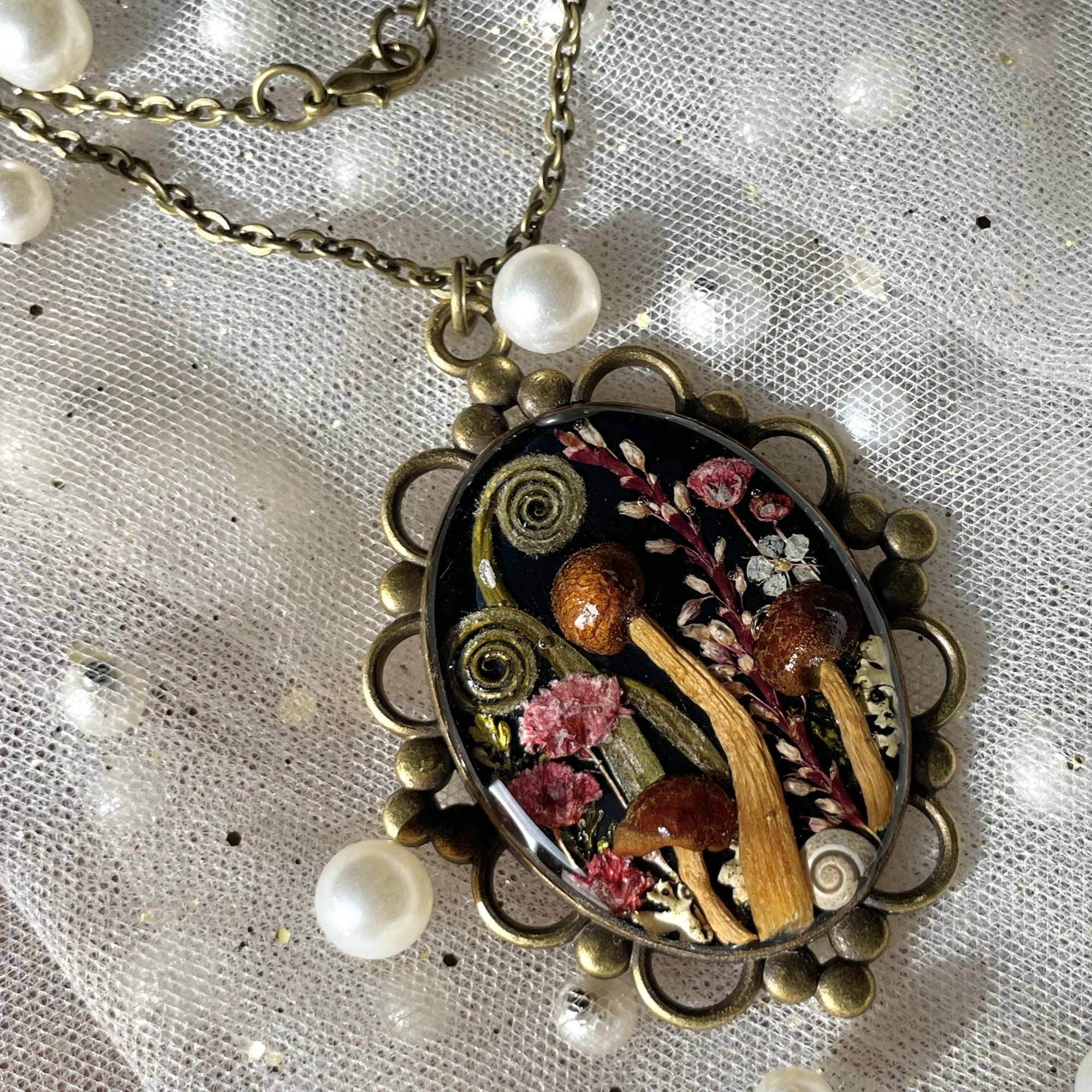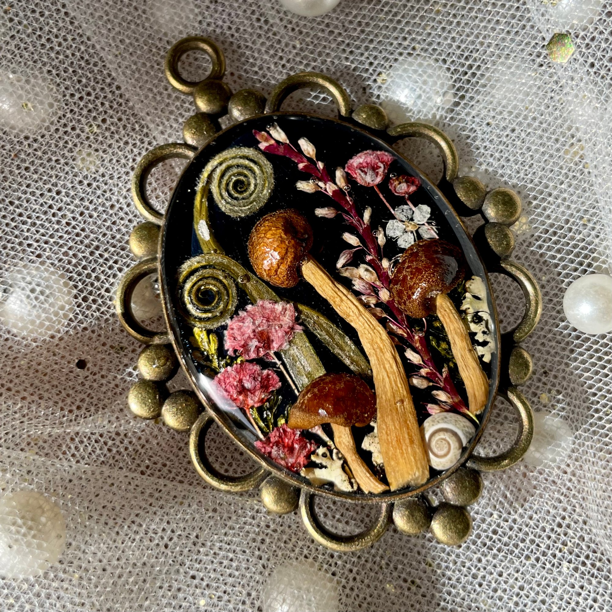 Lovingly crafted, floral ocean-themed pendant, featuring real pressed blooms preserved in resin and set in a metal bezel. Each piece is one of a kind; a small garden to carry with you.