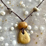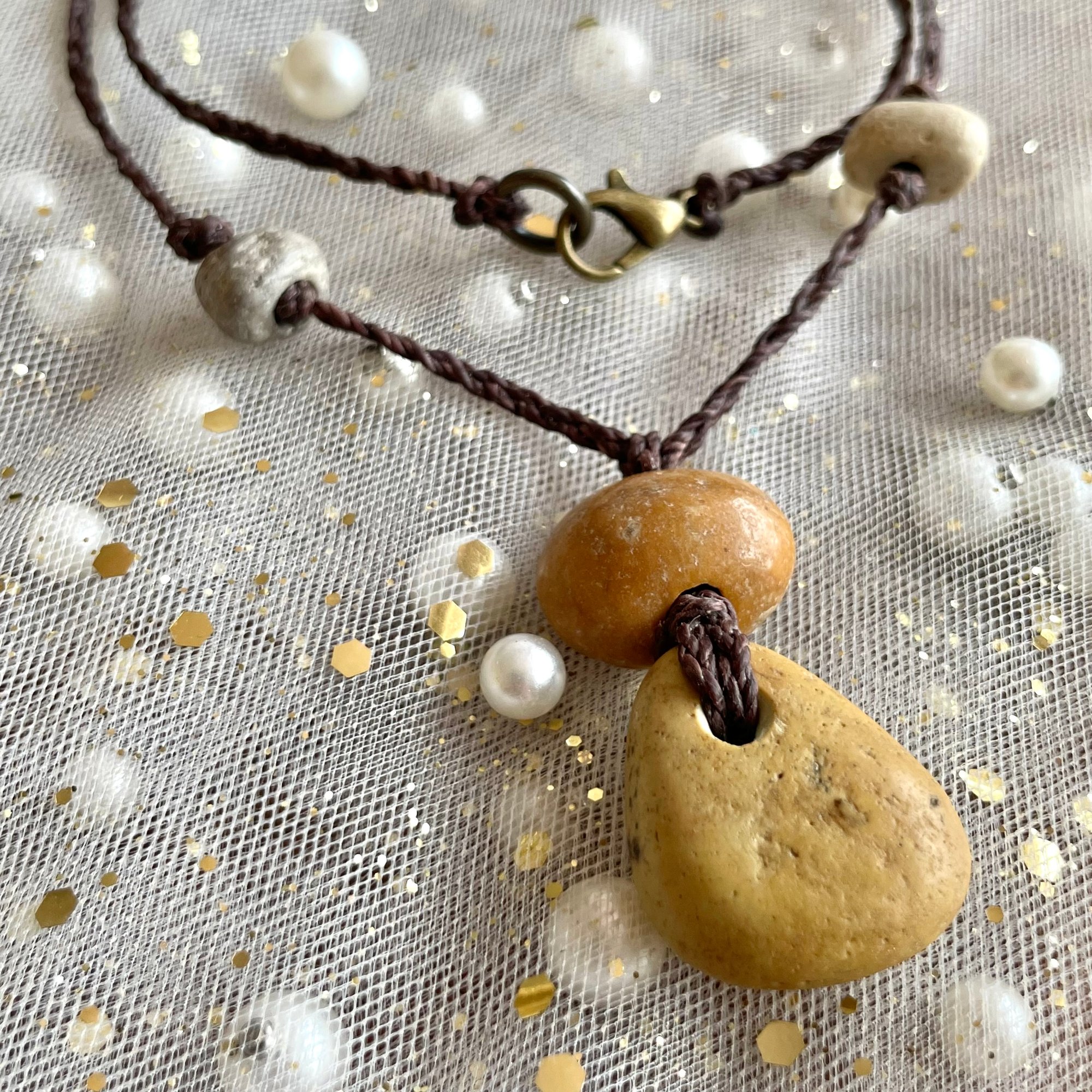 Grounding , earthy and tumbled smooth by natural forces, hand-collected, drilled and polished, these stones are strung on hand braided wax cord cord with bronze hardware to create a one-of-a-kind unisex necklace, rooted in simplicity.