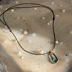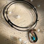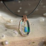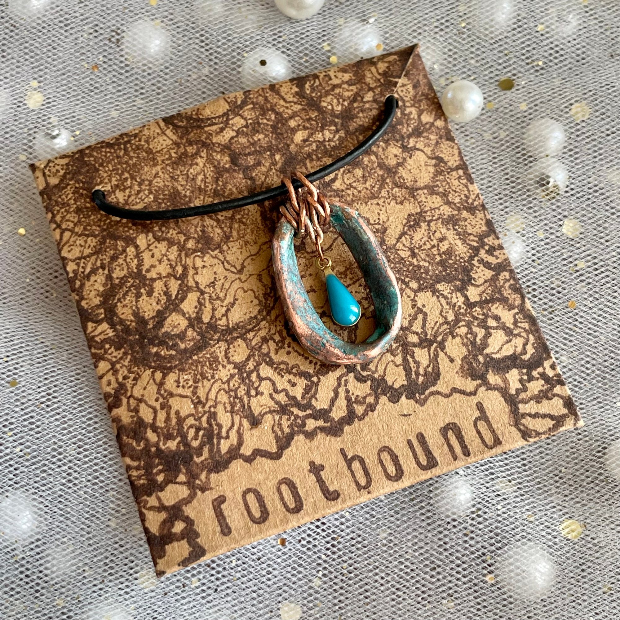 Handmade blue geometric oval copper patina pendant necklace with corresponding teardrop charm on adjustable black leather cord. This piece started its life out as a recycled copper pipe and has been lovingly transformed into the necklace you see above.