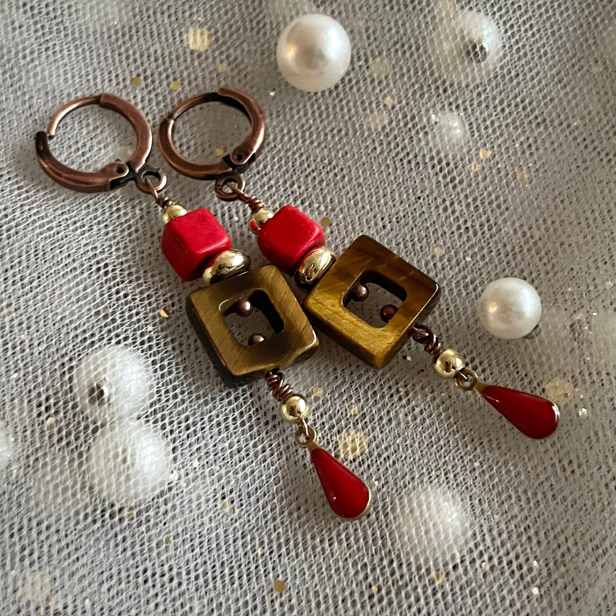 Beaded earrings with gold colored accents and copper plated closed loop earring hoops.