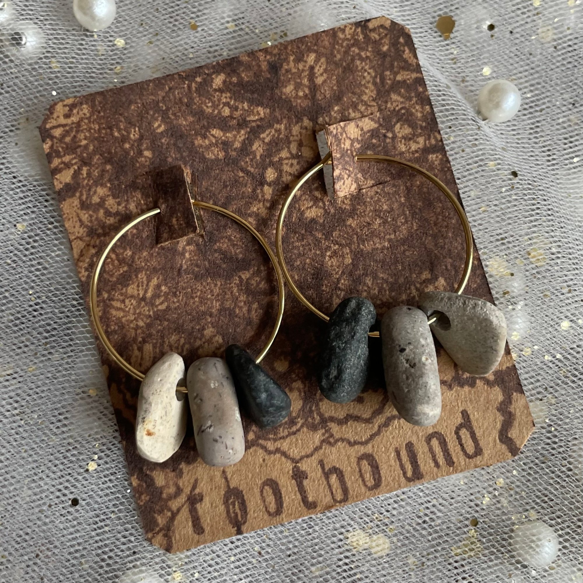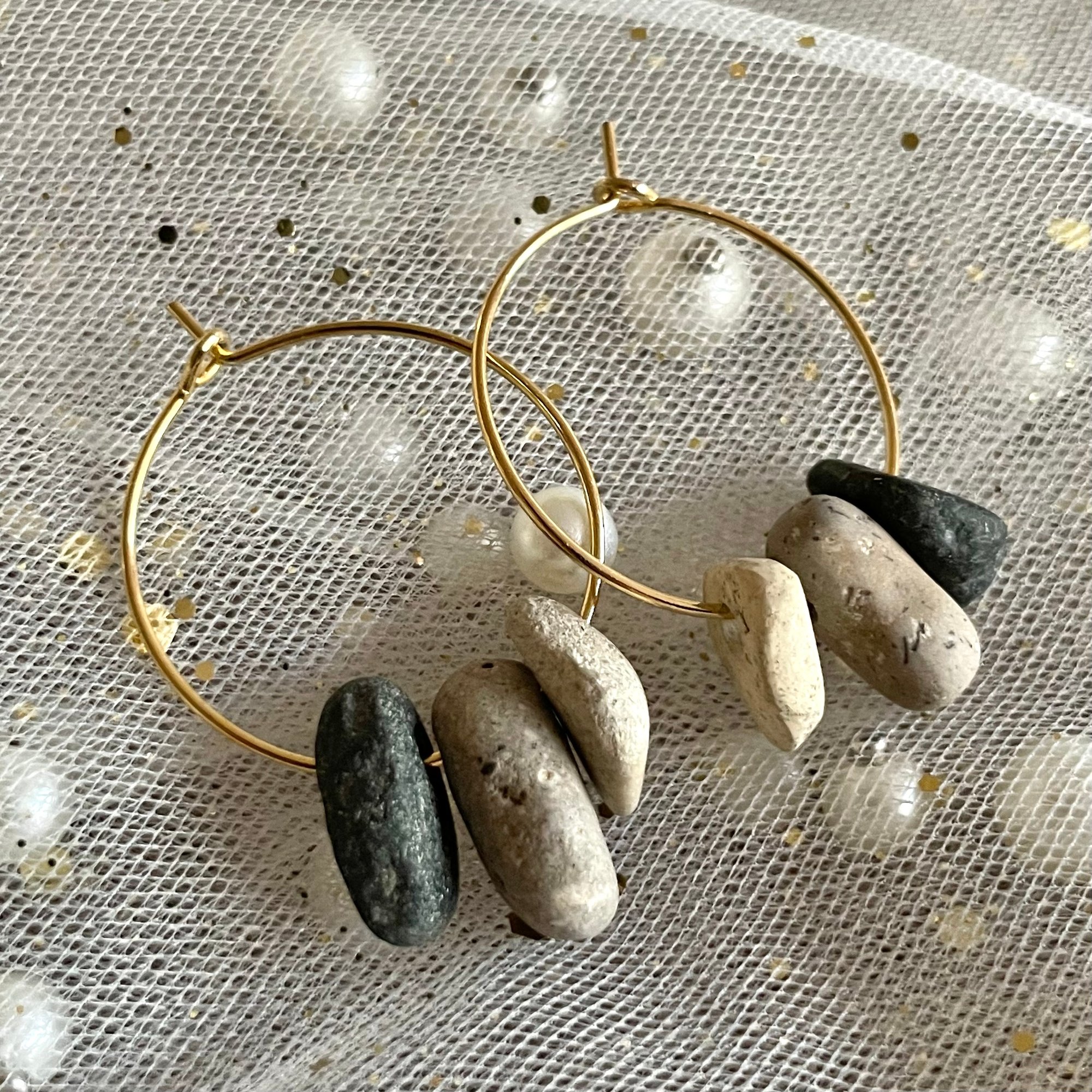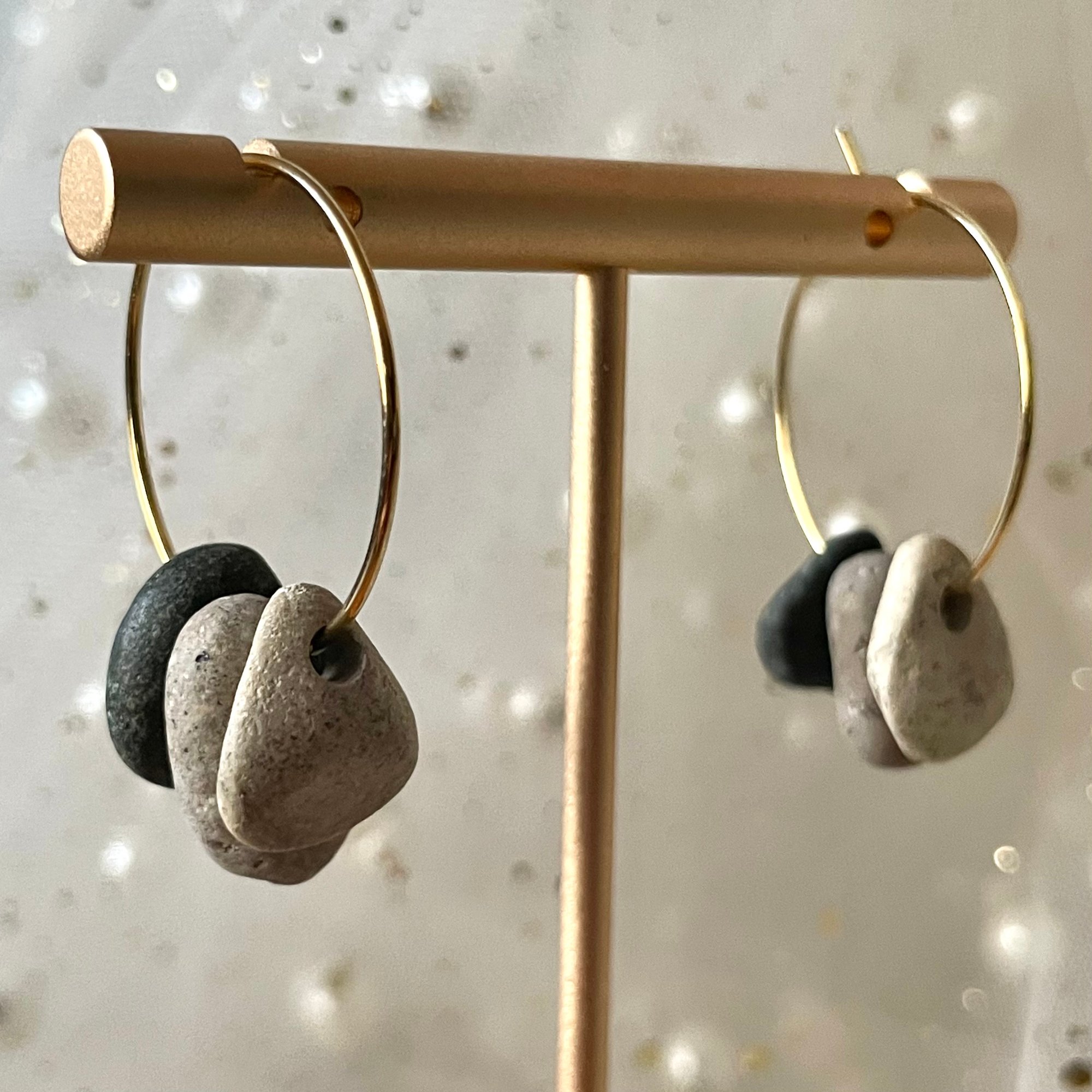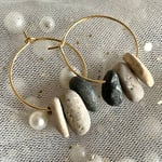Tumbled smooth by natural forces, hand-collected, drilled and polished, these stones are brought together on 18K gold-plated hoops to create a one-of-a-kind pair of earrings, rooted in simplicity.